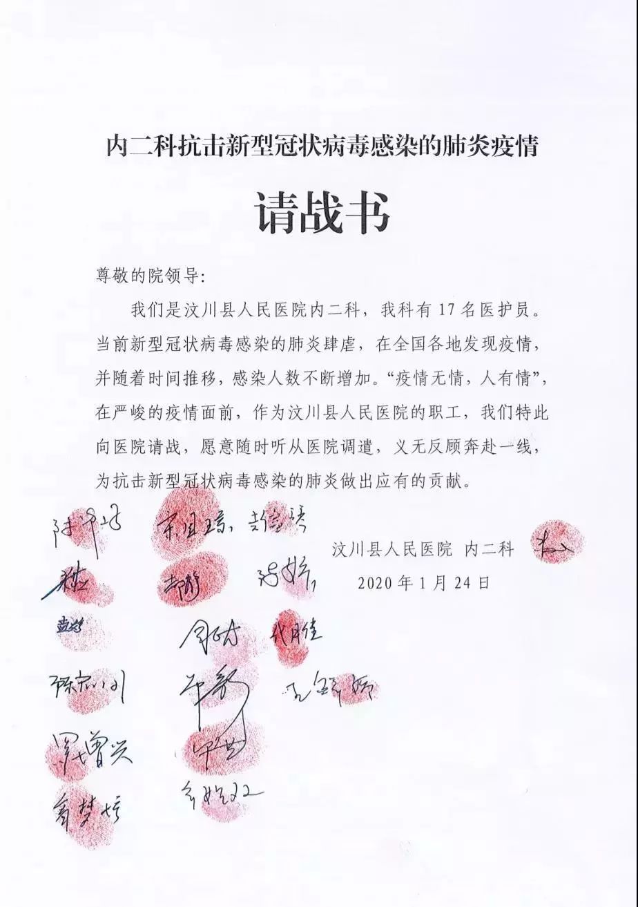 汶川县人民医院内二科医护人员抗击新冠肺炎请战书