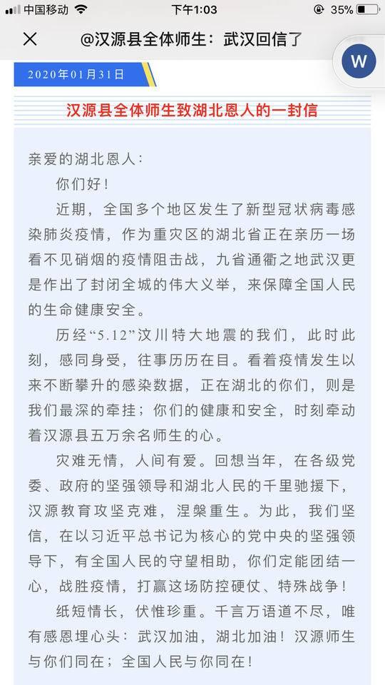 汉源县教育局副局长袁巧娟说:“现在武汉本来就忙,发信过去害怕给他们添乱,所以最后我们选择了在自己的微信平台上发出这封信。”没想到,这封慰问信发出不久,便得到了许多热心人的转发。当年,武汉市政协负责对口援建汉源大庄小学,这次正是由大庄小学校长把这封慰问信转发给了武汉市政协。