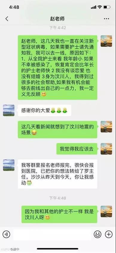 1月24日,同样是大年三十,四川省第四人民医院征集援助武汉的第一批医护人员。佘沙看到通知后,第一时间报名请战。但由于第一批救援队选派的是重症监护室和呼吸科的护士,佘沙没能入选。1月25日,第四人民医院发出召集第二批医疗队成员的通知。得知消息,佘沙第一时间给护士长发出这样一条微信。