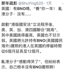 也有网友发帖表示:“乱港分子感动的哭了,但纷纷表示,自己根本没有bno护照啊!”
